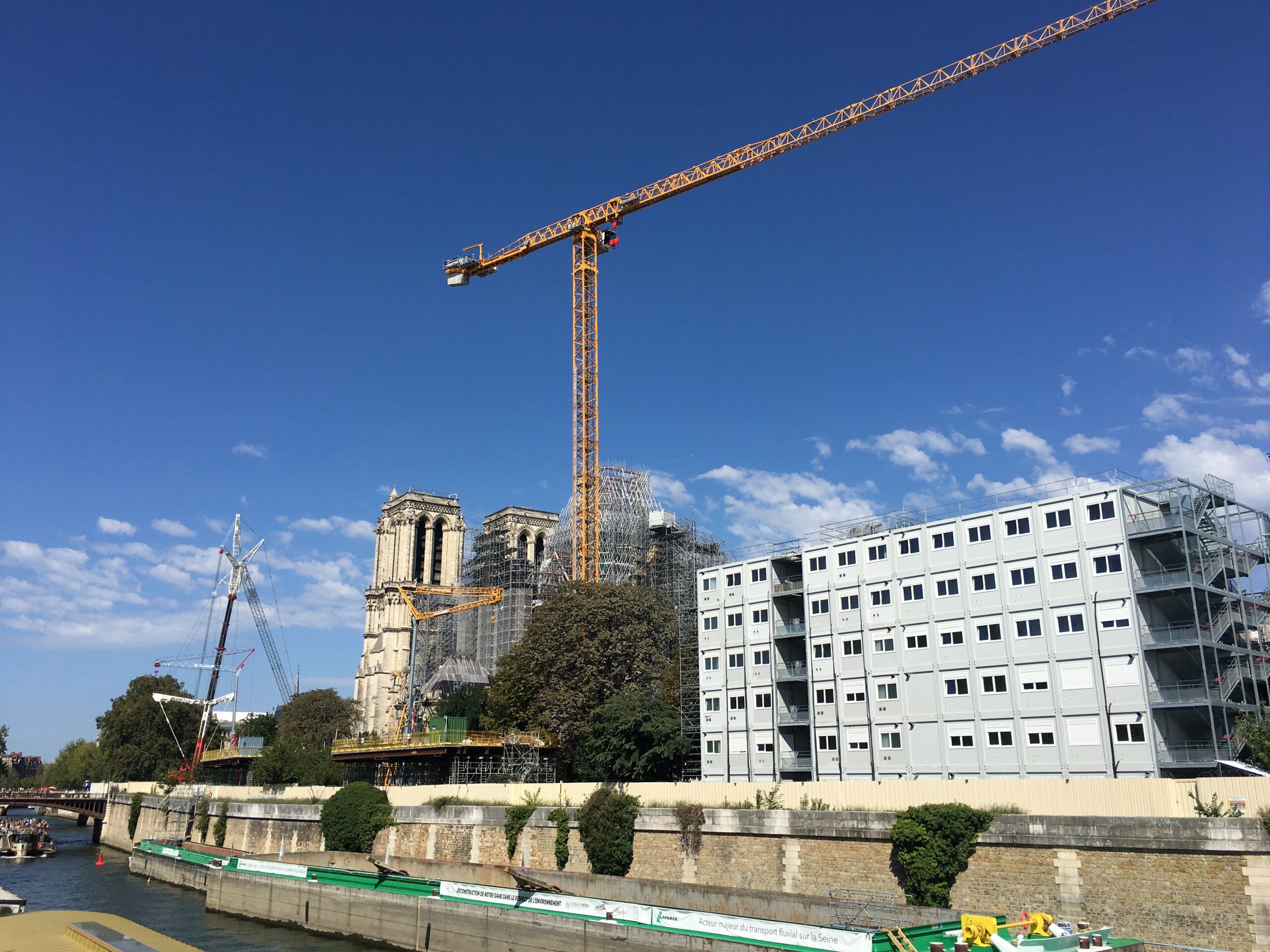 Grue, barges, logements pour la reconstruction de Notre-Dame